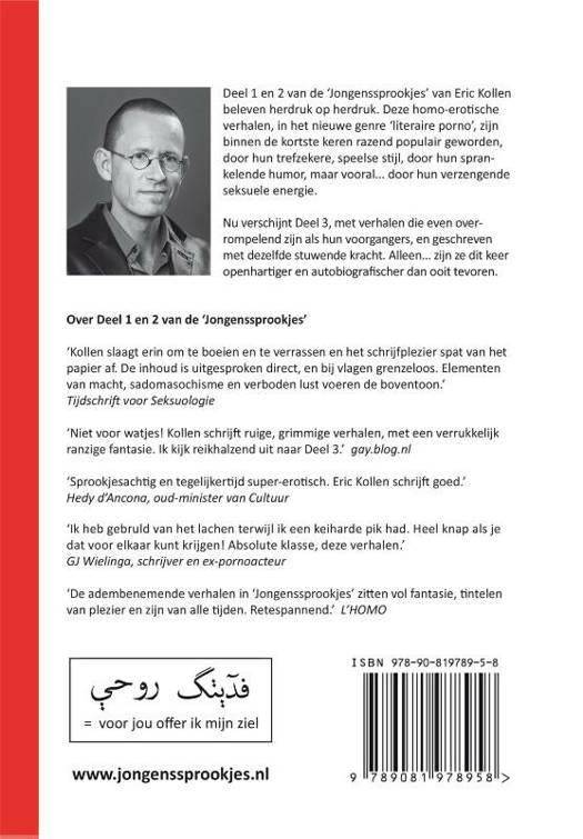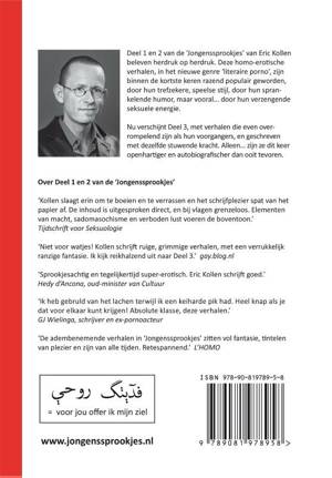 "Niet voor watjes!" gay.blog.nl - De 'Jongenssprookjes' van Eric Kollen zijn de succesvolste Nederlandse homoboeken in jaren, door hun adembenemende seksuele slagkracht en hun sprankelende humor. Nu verschijnt 'Deel 3', met verhalen die even overrompelend zijn als hun voorgangers, en geschreven met dezelfde stuwende kracht. Alleen... zijn ze dit keer openhartiger en autobiografischer dan ooit tevoren.