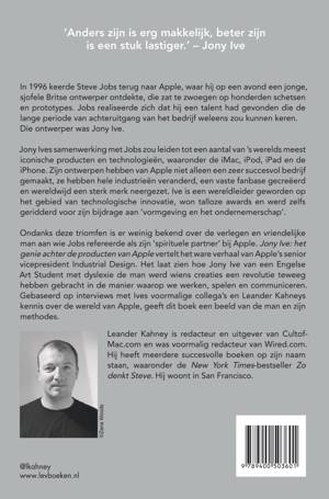 Jony Ives samenwerking met Jobs zou leiden tot een aantal van 's werelds meest iconische producten en technologieën, waaronder de iMac, iPod, iPad en de iPhone. Zijn ontwerpen hebben van Apple niet alleen een zeer succesvol bedrijf gemaakt, ze hebben hele industrieën veranderd, een vaste fanbase gecreëerd en wereldwijd een sterk merk neergezet. Ive is een wereldleider geworden op het gebied van technologische innovatie, won talloze awards en werd zelfs geridderd voor zijn bijdrage aan 'vormgeving en het ondernemerschap'. Ondanks deze triomfen is er weinig bekend over de verlegen en vriendelijke man aan wie Jobs refereerde als zijn 'spirituele partner' bij Apple. Jony Ive: het genie achter de producten van Apple vertelt het ware verhaal van Apple's senior vicepresident Industrial Design. Het laat zien hoe Jony Ive van een Engelse Art Student met dyslexie de man werd wiens creaties een revolutie teweeg hebben gebracht in de manier waarop we werken, spelen en communiceren. Gebaseerd op interviews met Ives voormalige collega's en Leander Kahneys kennis over de wereld van Apple, geeft dit boek een beeld van de man en zijn methodes.