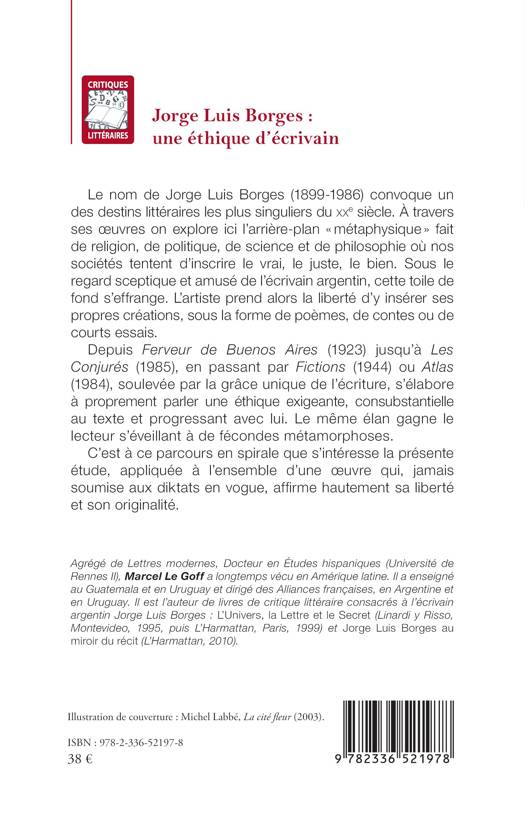 Le nom de Jorge Luis Borges (1899-1986) convoque un des destins littéraires les plus singuliers du XXe siècle. À travers ses oeuvres on explore ici l'arrière-plan métaphysique fait de religion, de politique, de science et de philosophie où nos sociétés tentent d'inscrire le vrai, le juste, le bien. Sous le regard sceptique et amusé de l'écrivain argentin, cette toile de fond s'effrange. L'artiste prend alors la liberté d'y insérer ses propres créations, sous la forme de poèmes, de contes ou de courts essais. Depuis Ferveur de Buenos Aires (1923) jusqu'à Les Conjurés (1985), en passant par Fictions (1944) ou Atlas (1984), soulevée par la grâce unique de l'écriture, s'élabore à proprement parler une éthique exigeante, consubstantielle au texte et progressant avec lui. Le même élan gagne le lecteur s'éveillant à de fécondes métamorphoses. C'est à ce parcours en spirale que s'intéresse la présente étude, appliquée à l'ensemble d'une oeuvre qui, jamais soumise aux diktats en vogue, affirme hautement sa liberté et son originalité.