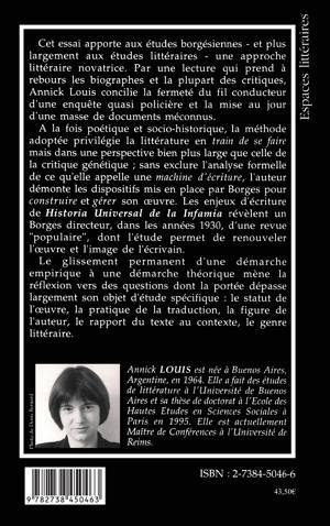 Cet essai apporte aux études borgésiennes et plus largement aux études littéraires une approche littéraire novatrice. Par une lecture qui prend à rebours les biographes et la plupart des critiques, Annick Louis concilie la fermeté du fil conducteur d'une enquête quasi policière et la mise au jour d'une masse de documents méconnus.