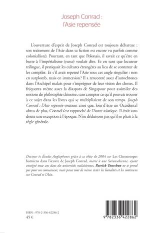 L'ouverture d'esprit de Joseph Conrad est toujours débattue son traitement de l'Asie dans sa fiction est encore vu parfois comme colonial(iste). Pourtant, en tant que Polonais, il savait ce qu'être en butte à l'impérialisme (russe) voulait dire. Et en tant que locuteur trilingue, il pratiquait les cultures étrangères au lieu de se contenter de les compiler. Et s'il avait repensé l'Asie sous cet angle singulier non en surplomb, mais en immersion ? Il a rencontré assez d'autochtones dans l'Archipel malais pour s'imprégner de leur vision des choses. Il fréquenta même assez la diaspora de Singapour pour assimiler des notions de philosophie chinoise, sans compter ce qu'il pouvait trouver à ce sujet dans les livres qui se multipliaient de son temps. Joseph Conrad l'Asie repensée soutient ainsi que, loin d'être un Occidental obtus de plus, Conrad s'est rapproché de l'Autre asiatique. Il était sans doute une exception à l'époque. N'en déduisons pas qu'il se pliait à la règle générale.