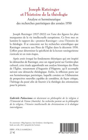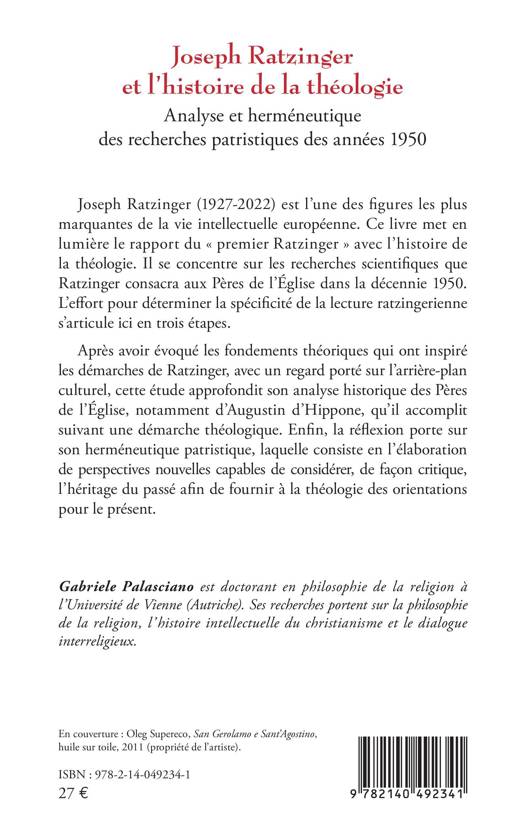 Joseph Ratzinger (1927-2022) est l'une des figures les plus marquantes de la vie intellectuelle européenne. Ce livre met en lumière le rapport du « premier Ratzinger » avec l'histoire de la théologie. Il se concentre sur les recherches scientifiques que Ratzinger consacra aux Pères de l'Église dans la décennie 1950. L'effort pour déterminer la spécificité de la lecture ratzingerienne s'articule ici en trois étapes. Après avoir évoqué les fondements théoriques qui ont inspiré les démarches de Ratzinger, avec un regard porté sur l'arrière-plan culturel, cette étude approfondit son analyse historique des Pères de l'Église, notamment d'Augustin d'Hippone, qu'il accomplit suivant une démarche théologique. Enfin, la réflexion porte sur son herméneutique patristique, laquelle consiste en l'élaboration de perspectives nouvelles capables de considérer, de façon critique, l'héritage du passé afin de fournir à la théologie des orientations pour le présent.