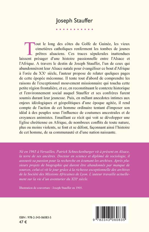 Tout le long des côtes du Golfe de Guinée, les vieux cimetières catholiques renferment les tombes de jeunes prêtres alsaciens. À travers le destin de Joseph Stauffer, l'un de ceux qui abandonnèrent leur Alsace natale pour évangéliser ce bout d'Afrique à l'orée du XXe siècle, l'auteur relate les pages de cette épopée méconnue. Il tente, en reconstituant le contexte historique et sociétal de Stauffer, de comprendre les raisons de ce mouvement missionnaire, en mêlant aux anecdotes intimes les enjeux idéologiques et géopolitiques de cette époque agitée.