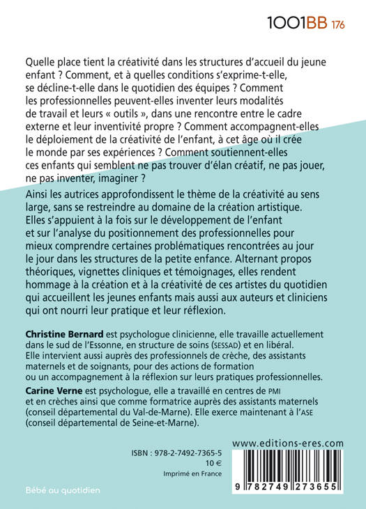 Dans cet ouvrage, les autrices approfondissent le thème de la créativité au sens large, sans se restreindre au domaine de la création artistique. Cela leur permet de toucher à la fois au développement de l'enfant et au positionnement des professionnels, mais également de mieux comprendre certaines problématiques rencontrées au quotidien dans les structures accueillant le jeune enfant. Alternant propos théoriques, vignettes cliniques et témoignages, elles rendent hommage à la création et à la créativité de ces artistes du quotidien que sont les professionnel·le·s de la petite enfance et aux auteurs et cliniciens qui ont nourri leur pratique et leur réflexion.