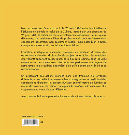 Issu du protocole d’accord conclu le 25 avril 1983 entre le ministère de l’Éducation nationale et celui de la Culture, institué par une circulaire du 25 juin 1984, le métier de musicien intervenant est exercé, depuis quatre décennies, par quelques milliers de professionnels dont les interventions concernent désormais, non seulement l’école, mais aussi bien d’autres champs – socio-éducatif, social, médico-social, etc. Éducation artistique et culturelle, pratiques en amateur, diversité des expressions culturelles, droits culturels, projets de territoire.. les musiciens intervenants apportent de nos jours, en milieu rural comme dans les villes moyennes ou les métropoles, des réponses pertinentes aux enjeux de notre temps, mais souffrent cependant d’un déficit criant de visibilité et de reconnaissance. En présentant des actions menées dans une trentaine de territoires différents, en recueillant la parole de leurs protagonistes, en sollicitant des contributions d’experts, le présent ouvrage entend mettre en lumière ce métier de passion et de relation qui a placé la création, la transmission et la coopération au coeur de son référentiel. Avec pour ambition de permettre à chacun de « jouer, vibrer, résonner ». COMMENTÂ ? À l’instigation conjointe du Conseil national des centres de formation des musiciens intervenants (CN-CFMI), de la Fédération nationale des musiciens intervenants (FNAMI) et de l’association Conservatoires de France, Michel Kneubühler, expert en politiques culturelles, a parcouru la France à la rencontre d’une centaine d’acteurs, en majorité des musiciens intervenants, mais aussi leurs partenaires – enseignants, éducateurs, animateurs... – ou leurs employeurs –élus, directeurs de conservatoires ou responsables associatifs. Avec l’aide d’un comité éditorial regroupant des responsables des trois organismes déjà cités, Michel Kneubühler a rapporté de ses deux années d’enquête une trentaine de reportages richement illustrés, enrichis d’entretiens, de contributions sollicitées auprès de spécialistes et de quelques documents d’archives.