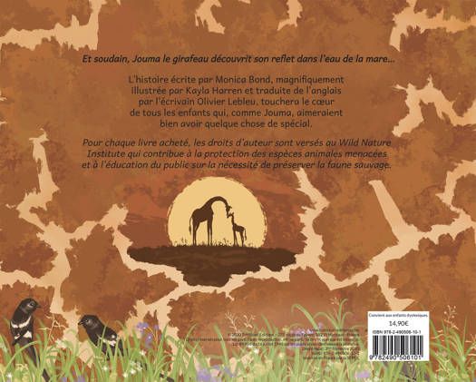 Et soudain, Jouma découvrit son reflet dans l'eau de la mare... Jouma est un bébé girafeau qui découvre qu'il ressemble à toutes les autres girafes et qu'il n'a rien qui le distingue. Découragé, il se confie à sa mère qui lui explique combien précieuses sont les caractéristiques de la girafe pour survivre dans la savane. La mère de Jouma lui montre aussi que chaque girafe a un modèle unique de taches, ce qui rend chaque individu différent et unique. La mère de Jouma conclut que chaque girafe est unique à la fois à l'extérieur et à l'intérieur, et qu'elle aime son bébé Jouma par-dessus tout. L'histoire magnifiquement illustrée touchera le coeur de tous les enfants qui, comme Jouma, aimeraient bien avoir quelque chose de spécial. Pour chaque livre acheté, les droits d'auteur sont versés au Wild Nature Institute qui contribue à la protection des espèces animales menacées et à l'éducation du public sur la nécessité de préserver la faune sauvage.