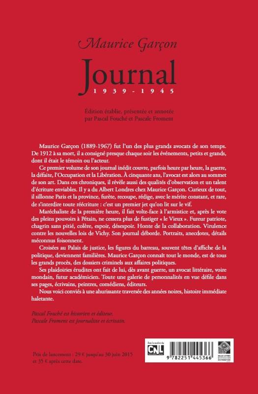 Ce premier volume de son journal inédit couvre, parfois heure par heure, la guerre, la défaite, l'Occupation et la Libération. À cinquante ans, l’avocat est alors au sommet de son art. Dans ces chroniques, il révèle aussi des qualités d’observation et un talent d’écriture enviables. Il y a du Albert Londres chez Maurice Garçon. Curieux de tout, il sillonne Paris et la province, furète, recoupe, rédige, avec le mérite constant, et rare, de s’interdire toute réécriture : c’est un premier jet qu’on lit sur le vif.