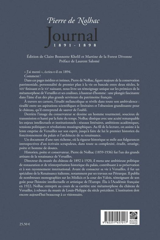 " J'ai menti ", ecrira-t-il en 1894. Comment ? Dans ces pages inedites et intimes, Pierre de Nolhac, figure majeure de la conservation patrimoniale, personnalite de premier plan a la vie en bascule entre deux siecles, le XIXe finissant et le XXe naissant, nous livre un temoignage unique sur les premices de la metamorphose de Versailles et ses coulisses, a hauteur d'homme: une plongee fascinante dans l'ame d'un des plus grands serviteurs du patrimoine francais. A travers ses carnets, l'erudit melancolique se revele dans toute son ambivalence: tiraille entre ses aspirations scientifiques et litteraires et l'obsession grandissante pour le chateau, qu'il entreprend de sauver de l'oubli. Derriere l'image du conservateur se dessine un homme tourmente, soucieux de transmission et hante par la fuite du temps. Nolhac disseque avec une acuite remarquable les enjeux intellectuels et institutionnels: reseaux litteraires, ambitions academiques, tensions politiques et revolutions museographiques. Au fil de la lecture, on assiste a la lente emprise de Versailles sur son esprit, jusqu'a faire de lui le premier historien du fonctionnement du palais et l'architecte de sa renaissance. Un document d'une rare richesse, ou la rigueur historique se mele aux fulgurances introspectives d'un ecrivain scrupuleux, dans toute sa complexite, erudit, stratege, poete et homme de doutes. Historien, poete et conservateur, Pierre de Nolhac (1859-1936) fut l'un des grands artisans de la renaissance de Versailles. Directeur du musee du chateau de 1892 a 1920, il mena une ambitieuse politique de restauration et de reinterpretation historique du palais, contribuant a sa preservation et a son rayonnement international. Avant de consacrer sa vie a Versailles, il fut un specialiste de la Renaissance italienne, notamment par ses travaux sur Petrarque. Il publia de nombreuses monographies sur les Medicis et la cour des Valois, temoignant de son gout pour l'histoire intellectuelle et artistique de l'Europe. Elu a l'Academie francaise en 1922, Nolhac entreprit au cours de sa carriere une metamorphose du chateau de Versailles, a rebours du musee de Louis-Philippe du siecle precedent. L'institution doit encore aujourd'hui beaucoup a ce visionnaire.