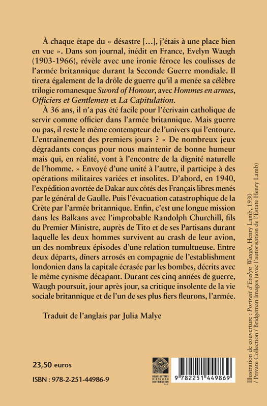 A chaque etape du " desastre [], j'etais a une place bien en vue ". Dans son journal, inedit en France, Evelyn Waugh (1903-1966), revele avec une ironie feroce les coulisses de l'armee britannique durant la Seconde Guerre mondiale. Il tirera egalement de la drole de guerre qu'il a menee sa celebre trilogie romanesque Sword of Honour, avec Hommes en armes, Officiers et Gentlemen et La Capitulation. A 36 ans, il n'a pas ete facile pour l'ecrivain catholique de servir comme officier dans l'armee britannique. Mais guerre ou pas, il reste le meme contempteur de l'univers qui l'entoure. L'entrainement des premiers jours ? " De nombreux jeux degradants concus pour nous maintenir de bonne humeur mais qui, en realite, vont a l'encontre de la dignite naturelle de l'homme. " Envoye d'une unite a l'autre, il participe a des operations militaires variees et insolites. D'abord, en 1940, l'expedition avortee de Dakar aux cotes des Francais libres menes par le general de Gaulle. Puis l'evacuation catastrophique de la Crete par l'armee britannique. Enfin, c'est une longue mission dans les Balkans avec l'improbable Randolph Churchill, fils du Premier Ministre, aupres de Tito et de ses Partisans durant laquelle les deux hommes survivent au crash de leur avion, un des nombreux episodes d'une relation tumultueuse. Entre deux departs, diners arroses en compagnie de l'establishment londonien dans la capitale ecrasee par les bombes, decrits avec le meme cynisme decapant. Durant ces cinq annees de guerre, Waugh poursuit, jour apres jour, sa critique insolente de la vie sociale britannique et de l'un de ses plus fiers fleurons, l'armee.
