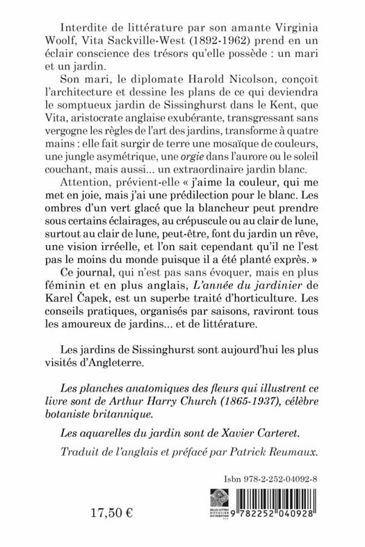 Interdite de litterature par son amante Virginia Woolf, Vita Sackville-West (1892-1962) prend en un eclair conscience des tresors qu'elle possede: un mari et un jardin. Son mari, le diplomate Harold Nicolson, concoit l'architecture et dessine les plans de ce qui deviendra le somptueux jardin de Sissinghurst dans le Kent, que Vita, aristocrate anglaise exuberante, transgressant sans vegrogne les regles de l'art des jardins, transforme a quatre mains: elle fait surgir de terre une mosaique de couleurs, une jungle asymetrique, une orgie dans l'aurore ou le soleil couchant, mais aussi...un extraordinaire jardin blanc. Attention, previent-elle "j'aime la couleur, qui me met en joie, mais j'ai une predilection pour le blanc. Les ombres d'un vert glace que la blancheur peut prendre sous certains eclairages, au crepuscule ou au clair de lune, surtout au clair de lune, peut-etre, font du jardin un reve, une vision irreelle, et l'on sait cependant qu'il ne l'est pas le moins du monde puisque il a ete plante expres. " Ce journal, qui n'est pas sans evoquer, mais en plus feminin et en plus anglais, L'annee du jardinier de Karel ?apek, est un superbe traite d'horticulture. Les conseils pratiques, organises par saison, raviront tous les amoureux de jardins...et de litterature. Les jardins de Sissinghurst sont aujourd'hui les plus visites d'Angleterre. Les planches anatomiques des fleurs qui illustrent ce livre sont de Arthur Harry Church (1865-1937), celebre botaniste britannique. Les aquarelles du jardin sont de Xavier Carteret. Traduit de l'anglais et preface par Patrick Reumaux.