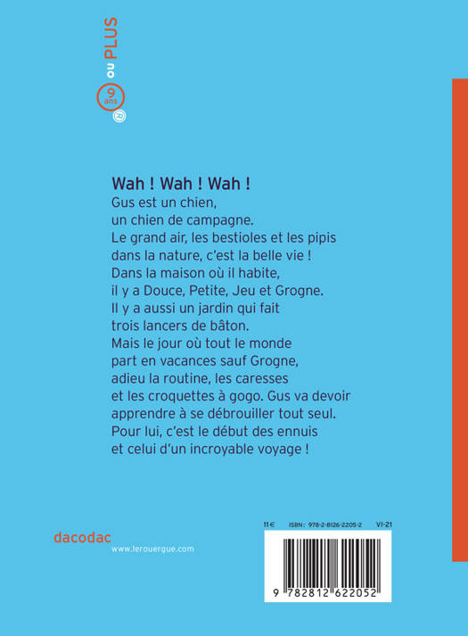 Wah ! Wah ! Wah ! Gus est un chien, un chien de campagne. Le grand air, les bestioles et les pipis dans la nature, c'est la belle vie ! Dans la maison où il habite, il y a Douce, Petite, Jeu et Grogne. Il y a aussi un jardin qui fait trois lancers de bâton. Mais le jour où tout le monde part en vacances sauf Grogne, adieu la routine, les caresses et les croquettes à gogo. Gus va devoir apprendre à se débrouiller tout seul. Pour lui, c'est le début des ennuis et celui d'un incroyable voyage !