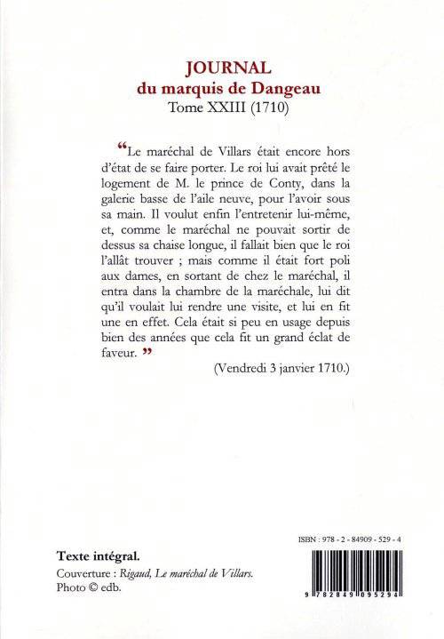 « Le maréchal de Villars était encore hors d'état de se faire porter. Le roi lui avait prêté le logement de M. le prince de Conty, dans la galerie basse de l'aile neuve, pour l'avoir sous sa main. Il voulut enfin l'entretenir lui-même, et, comme le maréchal ne pouvait sortir de dessus sa chaise longue, il fallait bien que le roi l'allât trouver ; mais comme il était fort poli aux dames, en sortant de chez le maréchal, il entra dans la chambre de la maréchale, lui dit qu'il voulait lui rendre une visite, et lui en fit une en effet. Cela était si peu en usage depuis bien des années que cela fit un grand éclat de faveur. »