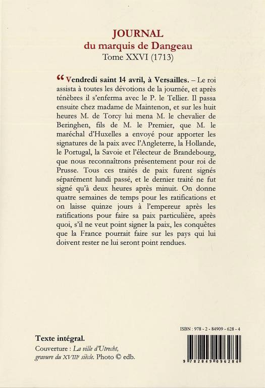 « Vendredi saint 14 avril, à Versailles. - Le roi assista à toutes les dévotions de la journée, et après ténèbres il s'enferma avec le P. le Tellier. Il passa ensuite chez madame de Maintenon, et sur les huit heures M. de Torcy lui mena M. le chevalier de Beringhen, fils de M. le Premier, que M. le maréchal d'Huxelles a envoyé pour apporter les signatures de la paix avec l'Angleterre, la Hollande, le Portugal, la Savoie et l'électeur de Brandebourg, que nous reconnaîtrons présentement pour roi de Prusse. Tous ces traités de paix furent signés séparément lundi passé, et le dernier traité ne fut signé qu'à deux heures après minuit. On donne quatre semaines de temps pour les ratifications et on laisse quinze jours à l'empereur après les ratifications pour faire sa paix particulière, après quoi, s'il ne veut point signer la paix, les conquêtes que la France pourrait faire sur les pays qui lui doivent rester ne lui seront point rendues.