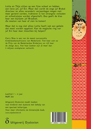 Lotte en Thijs zitten op een fijne school en hebben een lieve juf, juf Evi. Maar dan wordt de enge juf Brakel directeur en alles verandert: verjaardagen mogen niet meer gevierd worden, trakteren is ten strengste verboden en schoolreisjes worden afgeschaft. Dus geeft de klas haar een bijnaam: juf Braaksel. Ze moeten van haar af zien te komen! Maar dat is nog niet alles: Lotte heeft ook een geheim dat moet worden opgelost. Kan de magische ring van juf Evi haar daar misschien bij helpen?