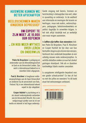 In Juffen zijn toffer dan meesters trekken Pedro De Bruyckere, Paul A. Kirschner en Casper Hulshof de lijn door van hun bestseller Jongens zijn slimmer dan meisjes. Gesteund door onderzoek bespreken ze een volledig nieuwe reeks onderwijsmythes. In verhitte debatten zoeken ze naar het sterkst gedragen standpunt. Ook als er daardoor hardnekkige fabels moeten sneuvelen.