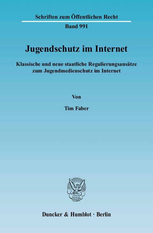 Der Autor befasst sich mit der hochaktuellen Thematik des Jugendschutzes im Internet. Die technischen Möglichkeiten dieses Mediums fordern den Staat heraus. Der Verfasser stellt die Rahmenbedingungen für eine effiziente Regulierung des Internet auf diesem Feld dar und zeigt neue Lösungsansätze auf. Zunächst werden Berührungspunkte der Kinder und Jugendlichen mit dem Internet und die daraus resultierenden Gefahren für deren Persönlichkeitsentwicklung beleuchtet. Um rechtliche Steuerungsstrategien entwickeln zu können, stellt Tim Faber Funktionsweise und Akteure des Internet im Überblick dar. Die staatsorganisatorischen und grundrechtlichen Möglichkeiten und Grenzen für eine staatliche Steuerung werden - von der Kompetenzproblematik bis zur Schutzpflicht - eingehend untersucht. Dabei stellt der Verfasser dem klassischen imperativen Jugendmedienschutz die neuen Gestaltungsmöglichkeiten der gesteuerten Selbstregulierung zur Seite. Der Jugendmedienschutz-Staatsvertrag und das Jugendschutzgesetz sind eingearbeitet und gewürdigt. Zur Effektivierung des Jugendschutzes bietet der Verfasser vielfältige Vorschläge, die sich auf das Konzept der gesteuerten Selbstregulierung stützen wie z. B. ein marktbestimmtes Ratingsystem mit staatlicher Koordinierungsstelle. Schließlich wird der Vorschlag eines bundeseinheitlichen Jugendmedienschutzes präsentiert.