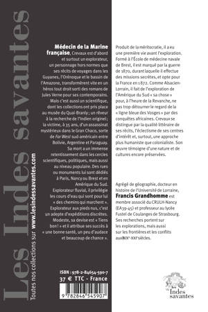 Médecin de la Marine française, Crevaux est d’abord et surtout un explorateur, un personnage hors normes que ses récits de voyages dans les Guyanes, l’Orénoque et le bassin de l’Amazone, transformèrent vite en un héros tout droit sorti des romans de Jules Verne pour ses contemporains. Mais c’est aussi un scientifique, dont les collections ont pris place au musée du Quai-Branly ; un rêveur à la recherche de l’Indien originel ; la victime, à 35 ans, d’un assassinat mystérieux dans le Gran Chaco, sorte de Far West sud-américain entre Bolivie, Argentine et Paraguay. Sa mort a un immense retentissement dans les cercles scientifiques, politiques, mais aussi au niveau populaire. Des rues ou monuments lui sont dédiés à Paris, Nancy ou Brest et en Amérique du Sud.