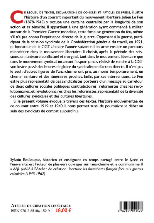 Ce recueil de textes, déclarations de congrès et articles de presse, illustre l’histoire d’un courant important du mouvement libertaire. Julien Le Pen (1878-1945) y occupe une certaine centralité par la longévité de son action et sa ténacité. Il appartient à une génération ayant commencé à militer autour de la Première Guerre mondiale, cette fameuse génération du feu, même s’il n’a pas connu l’expérience directe de la guerre. Opposant à la guerre, participant de la scission syndicale de la Confédération générale du travail, en 1921, et fondateur de la CGT-Unitaire l’année suivante, il incarne ensuite un parcours minoritaire dans le mouvement libertaire. Il choisit, après la période des scissions, un itinéraire conflictuel et marginal, tant dans le mouvement libertaire que dans le mouvement syndical, incarnant l’espoir jamais réalisé de rendre à la CGT son lustre passé des heures de gloire du syndicalisme d’action directe. Il n’est pas le seul ; d’autres figures de l’anarchisme ont pris, au moins temporairement, un chemin similaire et des itinéraires proches. Enfin, par ses interventions, Le Pen est le plus représentatif de ces syndicalistes porteurs d’un message au carrefour de deux cultures sociales politiques contradictoires : réformistes chez les révolutionnaires, et révolutionnaires chez les réformistes, représentatif de la diversité des cultures syndicales et des cultures libertaires.