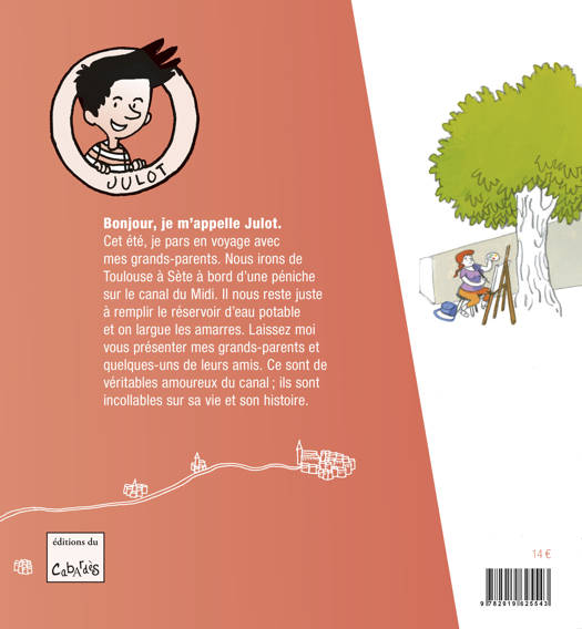 Julot monte sur la péniche de ses grands- parents et avec eux, part sur le canal du Midi de Toulouse jusqu’à l’étang de Thau. Lors de chaque halte, il découvre et observe: ouvrages d’art, vie passée des bateliers et des éclusiers, faune et flore... Les informations sont données par des questions-réponses en direction des adultes qui accompagnent Julot. En bas de chaque page se trouve le journal de bord de Julot avec ses remarques personnelles.