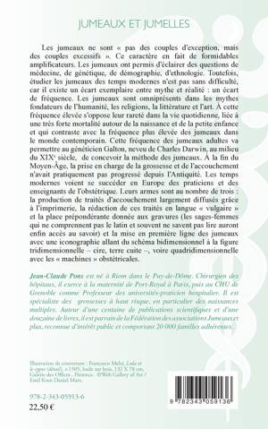 Les jumeaux ont permis d'éclairer des questions de médecine, de génétique, de démographie, d'ethnologie. Étudier les jumeaux des temps modernes n'est pas sans difficulté car il existe un écart exemplaire entre mythe et réalité : un écart de fréquence. Les jumeaux sont omniprésents dans les mythes fondateurs de l'humanité, les religions, la littérature et l'art. A cette fréquence élevée s'oppose leur rareté dans la vie quotidienne. Cet ouvrage est conseillé aux amateurs d'art, à ceux qui s'intéressent à l'évolution des idées scientifiques et médicales et à ceux que la gémellité passionne.