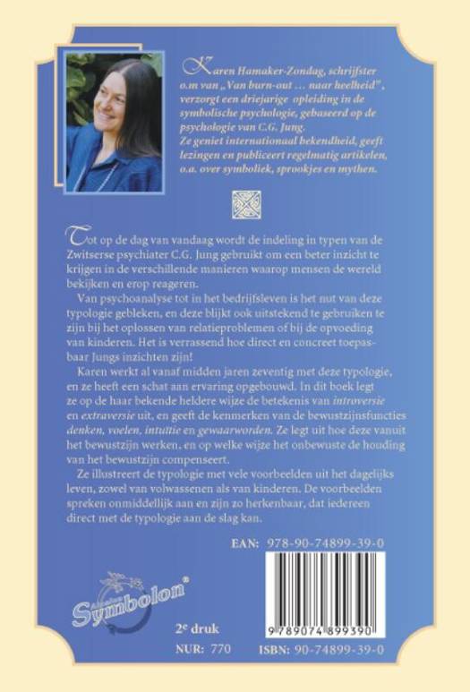 Karen werkt al vanaf midden jaren zeventig met deze typologie, en ze heeft een schat aan ervaring opgebouwd. In dit boek legt ze op de haar bekende heldere wijze de betekenis van introversie en extraversie uit, en geeft de kenmerken van de bewustzijnsfuncties denken, voelen, intuïtie en gewaarworden. Ze legt uit hoe deze vanuit het bewustzijn werken, en op welke wijze het onbewuste de houding