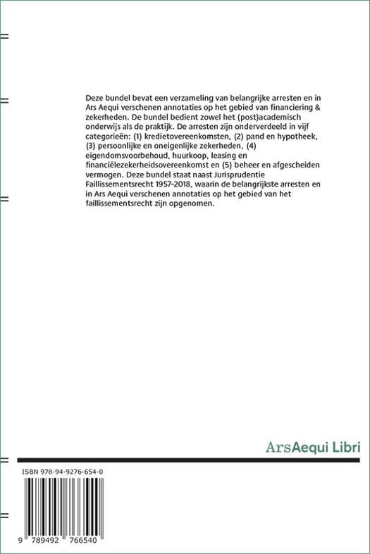 Deze bundel bevat een verzameling van belangrijke arresten en in Ars Aequi verschenen annotaties op het gebied van financiering & zekerheden. De bundel bedient zowel het (post)academisch onderwijs als de praktijk. De arresten zijn onderverdeeld in vijf categorieën: (1) kredietovereenkomsten, (2) pand en hypotheek, (3) persoonlijke en oneigenlijke zekerheden, (4) eigendomsvoorbehoud, huurkoop, leasing en financiëlezekerheidsovereenkomst en (5) beheer en afgescheiden vermogen. Deze bundel staat naast Jurisprudentie Faillissementsrecht 1957-2018, waarin de belangrijkste arresten en in Ars Aequi verschenen annotaties op het gebied van het faillissementsrecht zijn opgenomen.