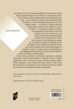 Jus Publicum. Un tel titre correspond parfaitement à la dédicataire des Mélanges offerts par la communauté universitaire à Anne-Marie Le Pourhiet. A travers son parcours professionnel et son investissement académique — elle est l’auteure du manuel de Droit constitutionnel chez Economica, d’un nombre incalculable d’articles dans des revues juridiques variées —, Anne-Marie Le Pourhiet, Professeur de droit public aux Université des Antilles, de Caen et de Rennes 1, a constamment souhaité se comporter en une généraliste de droit public et non en une spécialiste d’une niche n’arrivant pas à s’en extirper. D’un mémoire de recherche consacré à L’article 92 de la Constitution de 1958 aux écrits consacrés à la post-démocratie en passant par les spécificités insulaires, le référendum d’initiative citoyenne, la Cour européenne des droits de l’homme, rares ont été les secteurs du droit public qui n’ont pas été soumis à sa sagacité et, souvent, à sa la vigueur de plume. Sa participation au jury d’agrégation d’histoire du droit lui a permis en outre d’enrichir sa pensée et de cultiver de nouvelles amitiés.