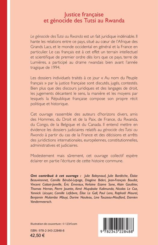 Le génocide des Tutsi au Rwanda est un fait juridique indéniable. Il hante les relations entre ce pays et le monde occidental en général et la France en particulier. Le cas français est à cet effet un terrain intellectuel et scientifique de premier ordre dès lors qu'il a participé au drame rwandais bien avant l’année tragique de 1994. Les dossiers individuels traités à ce jour « Au nom du Peuple français » par la justice française sont discutés, jugés, contestés. Cet ouvrage collectif entend mettre en évidence les dossiers judiciaires relatifs au génocide des Tutsi au Rwanda à partir du cas de la France et des décisions et arrêts des juridictions internationales, européennes, constitutionnelles, administratives et judiciaires.