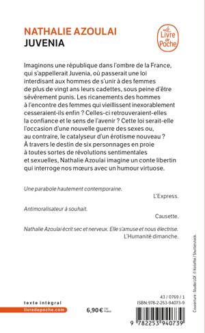 Imaginons une république dans l'ombre de la France, où passerait une loi interdisant aux hommes de s'unir à des femmes de plus de vingt ans leurs cadettes, sous peine d'être sévèrement punis. Et qui s'appellerait Juvenia. Les ricanements des hommes envers les femmes qui vieillissent inexorablement y cesseraient-ils enfin ? Celles-ci y retrouveraient-elles la confiance et le sens de l'avenir ? Cette loi serait-elle l'occasion d'une nouvelle guerre des sexes ou, au contraire, le catalyseur d'un érotisme nouveau ?