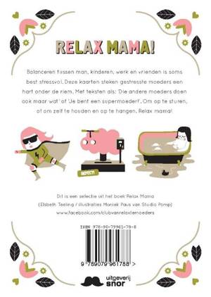 Balanceren tussen man, kinderen, werk en vrienden is soms best stressvol. Deze kaarten steken gestresste moeders een hart onder de riem. Met teksten als: 'Die andere moeders doen ook maar wat' of 'Je bent een supermoeder!'. Om op te sturen, of om zelf te houden en op te hangen. Relax mama!