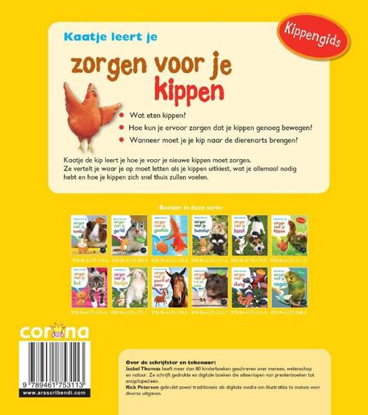Kitty de kat, Koen het konijn, Hanna de hamster en andere huisdieren leren kinderen hoe ze voor hen moeten zorgen. Ze leggen uit waar ze op moeten letten als ze een huisdier uitkiezen, wat ze allemaal nodig hebben om hun huisdier te verzorgen en hoe hun huisdier zich snel thuis zal voelen. Extra aantrekkelijk door de foto's en illustraties die zijn gebruikt. - Wat eten kippen? - Hoe kun je ervoor zorgen dat je kippen genoeg bewegen? - Wanneer moet je je kip naar de dierenarts brengen? Kaatje de kip leert je hoe je voor je nieuwe kippen moet zorgen. Ze vertelt je waar je op moet letten als je kippen uitkiest, wat je allemaal nodig hebt en hoe je kippen zich snel thuis zullen voelen.