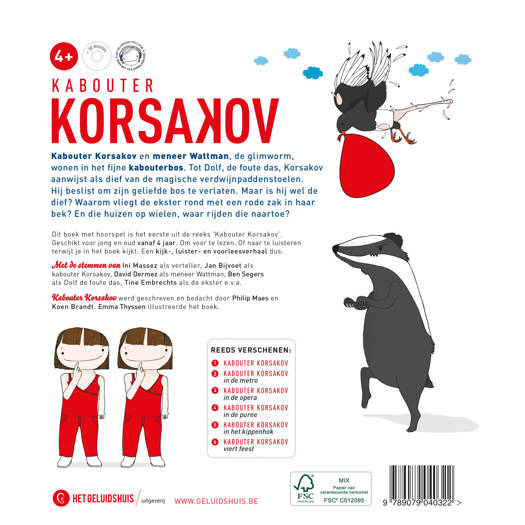 Kabouter Korsakov en meneer Wattman, de glimworm, wonen in het fijne kabouterbos. Wanneer Dolf, de foute das, Korsakov aanwijst als dief van de magische verdwijnpaddenstoelen, beslist de dappere kabouter om het bos te verlaten. Maar is kabouter Korsakov wel de dief? En waarom vliegt de ekster rond met een rode zak in haar bek? En die huizen op wielen, waar rijden die naartoe? Ontdek het in dit eerste verhaal uit de avontuurlijke reeks Kabouter Korsakov.