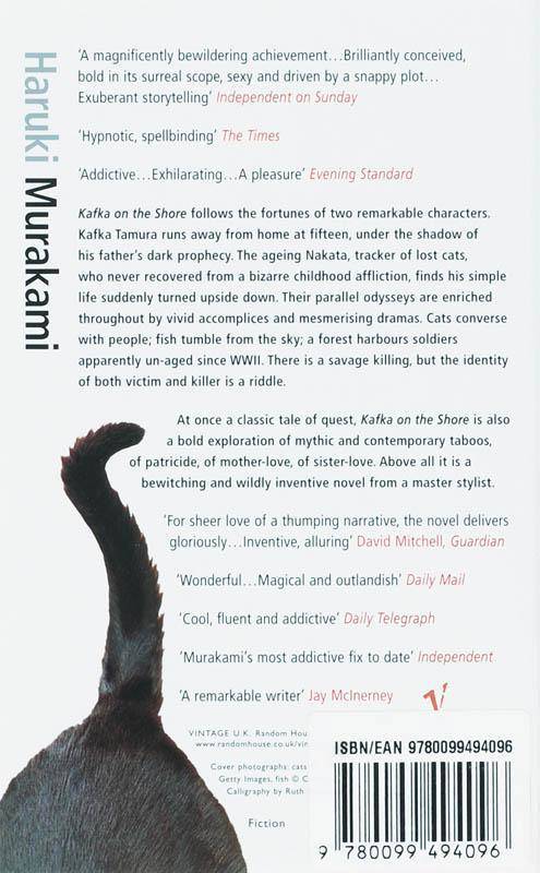The aging Nakata, tracker of lost cats, who never recovered from a bizarre childhood affliction, finds his pleasantly simplified life suddenly turned upside down. There is a savage killing, but the identity of both victim and killer is a riddle.