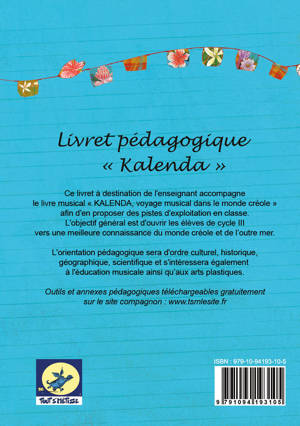 Ce livret à destination de l'enseignant accompagne le livre musical « KALENDA, voyage musical dans le monde créole » afin d'en proposer des pistes d'exploitation en classe. L'objectif général est d'ouvrir les élèves de cycle III vers une meilleure connaissance du monde créole et de l'outre mer. L'orientation pédagogique sera d'ordre culturel, historique, géographique, scientifique et s'intéressera également à l'éducation musicale ainsi qu'aux arts plastiques.