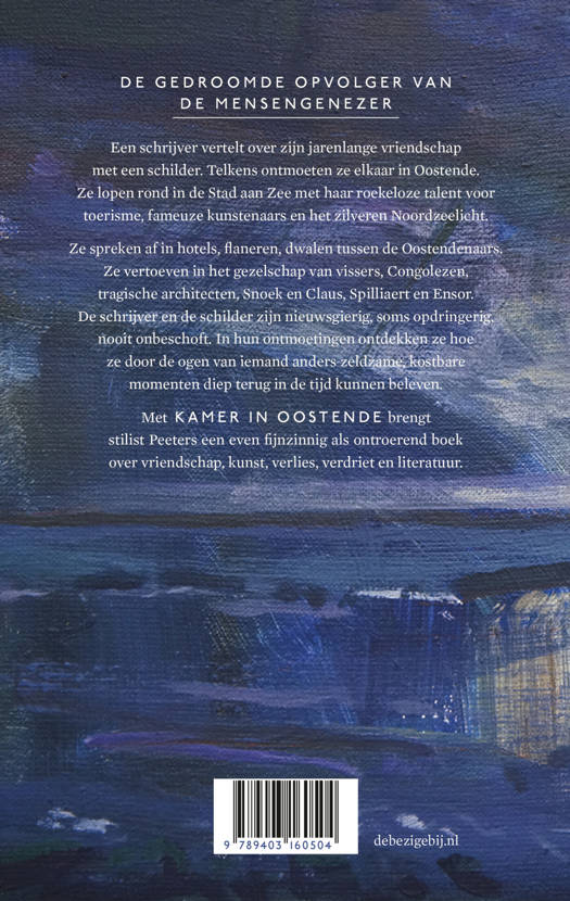 Een schrijver vertelt over zijn jarenlange vriendschap met een schilder. Telkens ontmoeten ze elkaar in Oostende, waar ze allebei ooit de liefde van hun leven gevonden hebben. Ze lopen rond in de Stad aan Zee met haar roekeloze talent voor toerisme, fameuze kunstenaars en het zilveren Noordzeelicht. Ze spreken af in hotels, flaneren, dwalen tussen de Oostendenaars. Ze vertoeven in het gezelschap van vissers, Congolezen, tragische architecten, Snoek en Claus, Spilliaert en Ensor. En vrouwen. De schrijver en de schilder zijn nieuwsgierig, soms opdringerig, nooit onbeschoft. Ze ontwikkelen een ironische onderzoeksmethode, het perspectivisme, op zoek naar de Onvoltooid Oostendse Tijd. Niets blijkt dan nog toevallig. In hun ontmoetingen ontdekken ze hoe ze op zeldzame, kostbare, melancholische momenten door elkaars ogen kunnen kijken. Zelfs diep terug in de tijd. Met Kamer in Oostende brengt stilist Peeters een even fijnzinnig als ontroerend boek.
