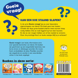 In de serie Goeie vraag! lees je over bijzondere eigenschappen van dieren. Dit boek gaat over koeien. Ontdek dat deze grote boederij-dieren twee soorten slaap nodig hebben. Dat ze vaak liggend op hun eten kauwen. En dat ze vier magen hebben om al het voedsel te verteren. Door de prachtige foto’s en leuke weetjes blijf je je verbazen!