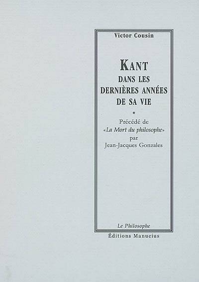 Et pour plus de clarté - ou de confusion -, les éditions Manucius ont décidé de rééditer le manuscrit manquant depuis plus d'un siècle et demi, le Kant dans les dernières années de sa vie de Victor Cousin (1830), et qui se révèle, lui aussi, possédé par le vertige infini de la réécriture du Même, prisonnier de cette fascination noire et grinçante pour les derniers jours du philosophe qui irradie l'ensemble de la littérature funéraire kantienne, archives toutes borgésiennes en lesquelles se côtoient Pierre Ménard, Ireneo Funes, et le Gardien aveugle de la Bibliothèque de Babel.