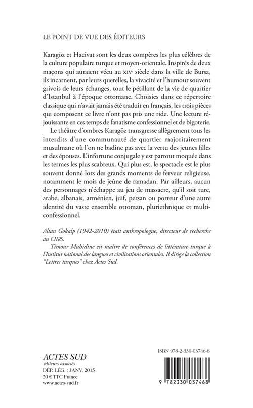 Karagöz et Hacivat sont les deux compères les plus célèbres de la culture populaire turque et moyen-orientale. Inspirés de deux maçons qui auraient vécu au xive siècle dans la ville de Bursa, ils incarnent, par leurs querelles, la vivacité et l'humour souvent grivois de leurs échanges, tout le pétillant de la vie de quartier d'Istanbul à l'époque ottomane. Choisies dans ce répertoire classique qui n'avait jamais été traduit en français, les trois pièces qui composent ce livre n'ont pas pris une ride. Une lecture réjouissante en ces temps de fanatisme confessionnel et de bigoterie.