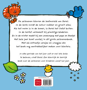 De seizoenen kleuren de leefwereld van Karel. In de lente wordt de natuur wakker en groeit alles. Als het warm is in de zomer, is Karel het liefst buiten. In de herfst verzamelt hij prachtige bladeren. En in de winter maakt hij een sneeuwpop met papa en Kaatje! Het hele jaar komt voorbij in dit grote seizoenenboek. Met als extraatje versjes en vraagjes die het boek nog aantrekkelijker maken voor kleuters. In elke periode van het jaar valt er wel iets leuks te beleven, vindt Karel. Een kleurrijk én leerrijk boek over de seizoenen voor kinderen vanaf 2,5 jaar.