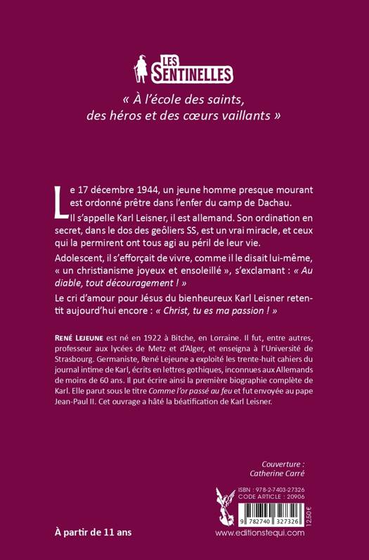 Né en 1915 dans une famille bavaroise, Karl est un enfant sportif, meneur, qui aime les sorties en vélo et les veillées autour d'un feu de camp. Adolescent, il s'efforce de vivre, comme il le dit lui-même, "un christianisme joyeux et ensoleillé", s'exclamant : 'Au diable, tout découragement !" À 19 ans, sa décision est prise : il veut devenir prêtre. Déporté à Dachau, il fait tant de bien autour de lui qu'on le surnomme "l'ange de Dachau". Le 17 décembre 1944, gravement malade, il est ordonné prêtre par un évêque prisonnier. Son ordination en secret, dans le dos des geôliers SS, est un vrai miracle, et ceux qui la permirent ont tous agi au péril de leur vie. Le cri d'amour pour Jésus du bienheureux Karl Leisner retentit aujourd'hui encore : "Christ, tu es ma passion !"