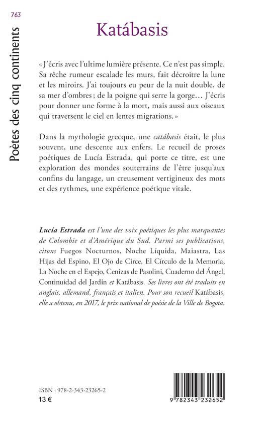 J'écris avec l'ultime lumière présente. Ce n'est pas simple. Sa rêche rumeur escalade les murs, fait décroitre la lune et les miroirs. J'ai toujours eu peur de la nuit double, de sa mer d'ombres; de la poigne qui serre la gorge... J'écris pour donner une forme à la mort, mais aussi aux oiseaux qui traversent le ciel en lentes migrations. Dans la mythologie grecque, une catábasis était, le plus souvent, une descente aux enfers. Le recueil de proses poétiques de Lucía Estrada, qui porte ce titre, est une exploration des mondes souterrains de l'être jusqu'aux confins du langage, un creusement vertigineux des mots et des rythmes, une expérience poétique vitale.