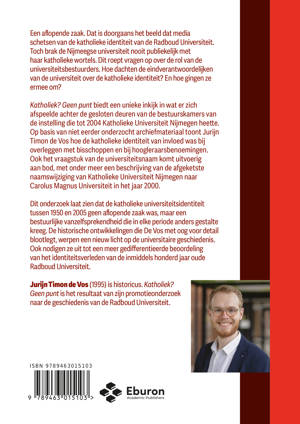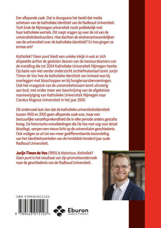 Katholiek? Geen punt biedt een unieke inkijk in wat er zich afspeelde achter de gesloten deuren van de bestuurskamers van de instelling die tot 2004 Katholieke Universiteit Nijmegen heette. Op basis van niet eerder onderzocht archiefmateriaal toont Jurijn Timon de Vos hoe de katholieke identiteit van invloed was bij overleggen met bisschoppen en bij hoogleraarsbenoemingen. Ook het vraagstuk van de katholieke universiteitsnaam komt uitvoerig aan bod, met onder meer de beschrijving van de afgeketste naamswijziging van Katholieke Universiteit Nijmegen naar Carolus Magnus Universiteit in het jaar 2000.
