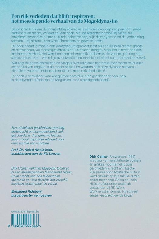 'Een uitstekend geschreven, grondig onderzocht en belangwekkend stuk geschiedenis. Aangename lectuur, maar vooral: bijzonder relevant voor onze wereld van vandaag.' - prof. dr. Abied Alsulaiman, hoofddocent Arabisch en Cultuurgeschiedenis KU Leuven 'Dirk Collier wekt het Mogolrijk tot leven in een meeslepend en fascinerend relaas. Een rijk dat boeit omwille van zijn pracht en macht, én omdat het verrassend veel zegt over onze eigen tijd. In een wereld waar culturele diversiteit, religieuze spanningen en geopolitieke onzekerheid almaar prangender worden, toont Collier hoe leiderschap, tolerantie en visie destijds het verschil maakten tussen bloei en verval.' - Mohamed Ridouani, burgemeester Leuven