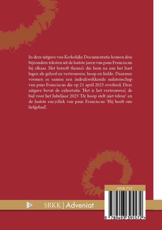 In deze uitgave van Kerkelijke Documentatie komen drie bijzondere teksten uit de laatste jaren van paus Franciscus bij elkaar. Het betreft thema’s die hem na aan het hart lagen als geloof en vertrouwen, hoop en liefde. Daarmee vormen ze samen een indrukwekkende nalatenschap van paus Franciscus die op 21 april 2025 overleed. Deze uitgave bevat de exhortatie ‘Het is het vertrouwen’, de bul voor het Jubeljaar 2025 ‘De hoop stelt niet teleur’ en de laatste encycliek van paus Franciscus ‘Hij heeft ons liefgehad’.