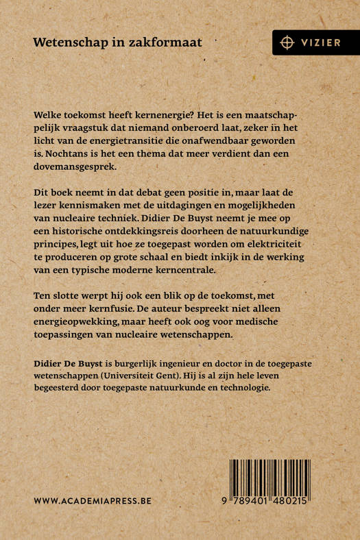 Dit boek neemt in dat debat geen positie in, maar laat de lezer kennismaken met de uitdagingen en mogelijkheden van nucleaire techniek. Didier De Buyst neemt je mee op een historische ontdekkingsreis doorheen de natuurkundige principes, legt uit hoe ze toegepast worden om elektriciteit te produceren op grote schaal en biedt inkijk in de werking van een typische moderne kerncentrale.