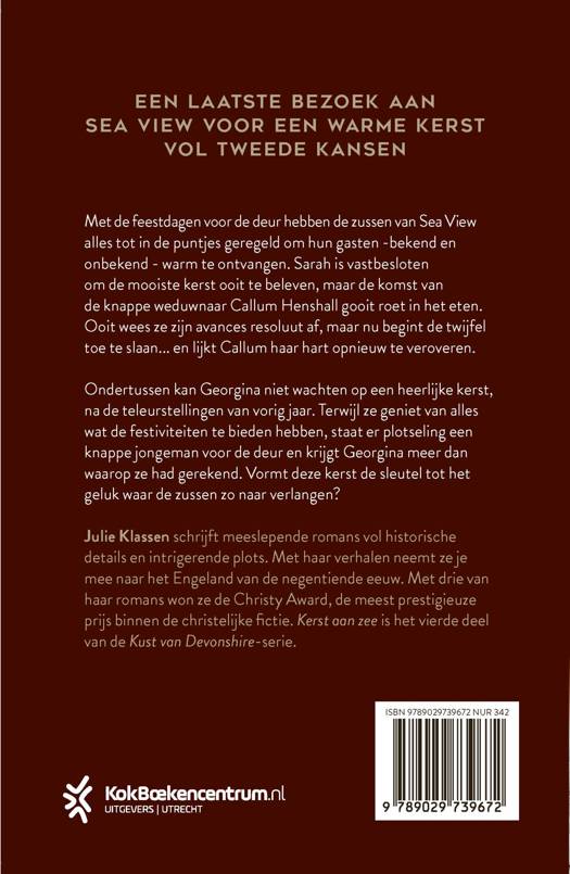 ‘Kerst aan zee’ is een historische kerstnovelle van Julie Klassen en het vierde deel in haar serie ‘De kust van Devonshire’. De feestdagen staan voor de deur, en de zussen Summers van het Sea View-pension bereiden zich voor op nieuwe én vertrouwde gasten. Sarah Summers is ervan overtuigd dat deze kerst ieders verwachtingen zal overtreffen, maar haar weerzien met de Schotse Callum Henshall brengt haar in de war. Eerder wees ze zijn avances af, maar nu wil het idee van een tweede kans haar maar niet loslaten…