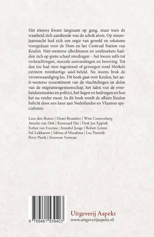 Het nieuws kwam langzaam op gang, maar toen de waarheid zich aandiende was de schok alom. Op nieuwjaarsnacht had zich een orgie van geweld en seksisme voorgedaan voor de Dom en het Centraal Station van Keulen. Niet-westerse allochtonen en asielzoekers hadden zich op grote schaal misdragen - het kwam zelfs tot verkrachtingen, massale aanrandingen en beroving. Tot dan toe had men ingestemd of gezwegen rond Merkels extreem ruimhartige asiel-beleid. Nu ineens brak de verontwaardiging los. Dit boek gaat over Keulen, het anti-westerse ressentiment van de vluchtelingen en delen van de migrantengemeenschap, het falen van de overheidsinstanties en politici, het liegen en bedriegen en hoe het nu verder moet. In dit boek wordt de affaire Keulen belicht door een keur aan Nederlandse en Vlaamse specialisten: