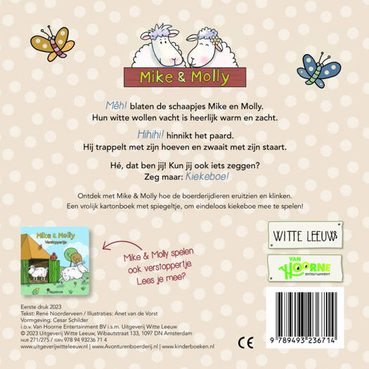 Ontdek met Mike & Molly hoe de boerderijdieren eruitzien en welke geluiden ze maken. Een vrolijk kartonboek met spiegeltje, om eindeloos kiekeboe mee te spelen!