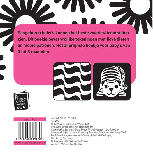 Pasgeboren baby’s kunnen zwart-witcontrasten het beste zien. Dit boekje bevat vrolijke tekeningen met lieve dieren en mooie patronen. Met vijf prachtige patronen en vijf lieve dieren sluiten deze boekjes perfect aan bij het zicht en de ontwikkeling van elke baby van 0 tot 3 maanden.