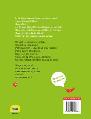 'Kikkers, kikkers en nog meer kikkers' is een grappig Theaterleesboek over - je raadt het al - kikkers! Kikkers? Ja! En over Kai en Kim, een kikkerist en een kok. Over het verschil tussen een kikker en een pad en over een kikker bij de kapper. Het boek staat vol met grappige weetjes en moppen over de groene glibbers. Dit deel van de Theaterlezenreeks is van de handen succesvolle (kinder)boekenmakers Erik van Os en Elle van Lieshout en de vrolijke illustraties zijn van Lars Deltrap (o.a. bekend van de serie 'Blitz!').